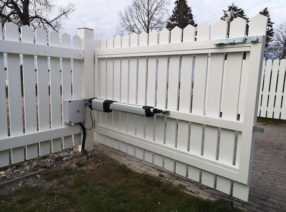 Aia ehitus Haapsalus. Valge värvitud vertikaal lipp puitaed. Ümarad lipiotsad. Paigaldatud jalgvärav,  tiibväravad BFT Automaatikaga.